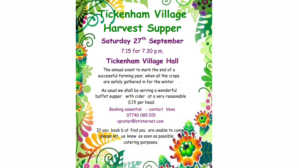 Tickenham Village Harvest Supper – Saturday 27th September.